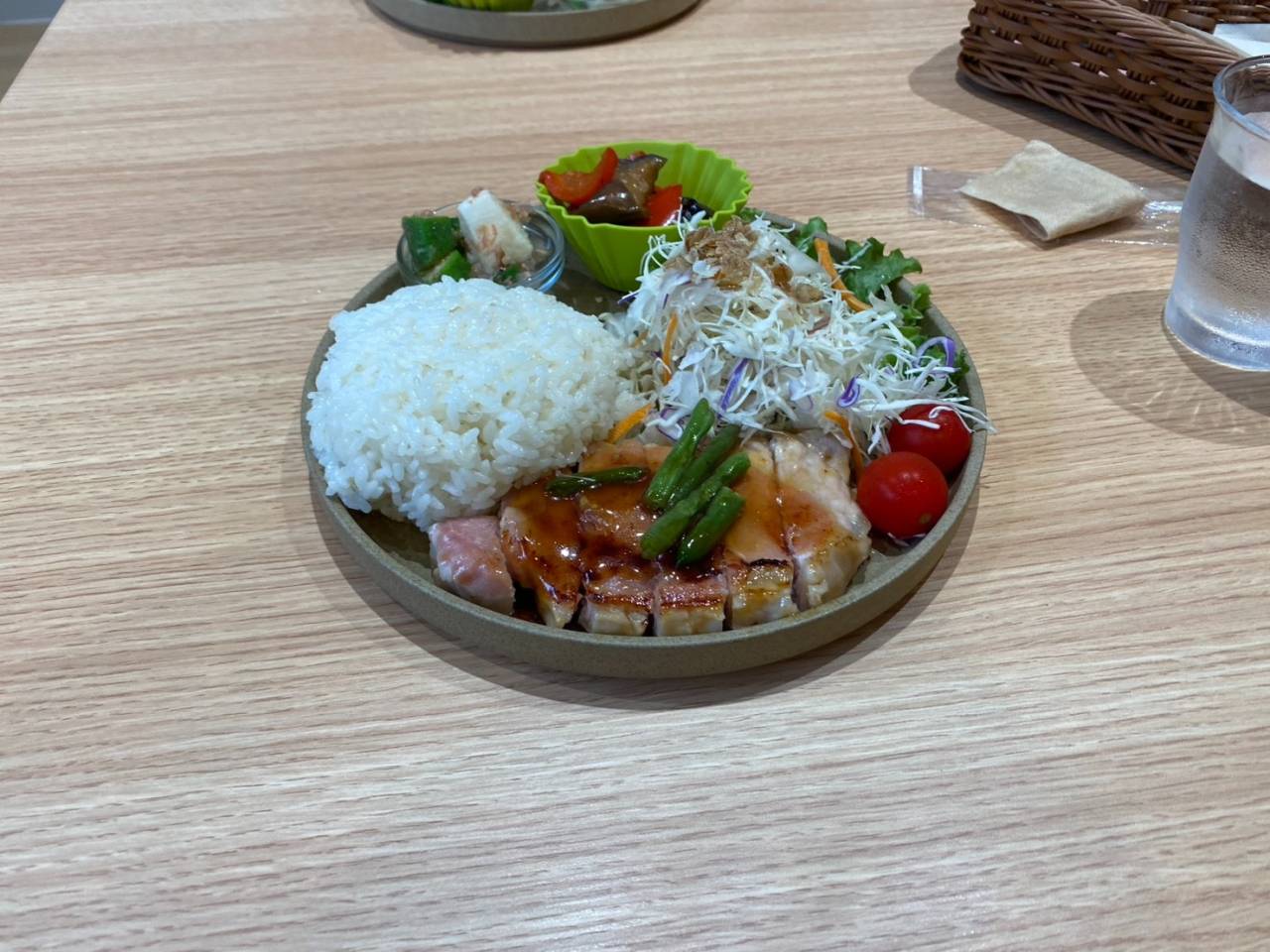 たっぷりご飯と、メインのお肉、新鮮なサラダ、小鉢のおかず、そしてかわいらしいミニトマト。バランスも完璧で、この一皿に込められた店のこだわりや心遣いを感じます。